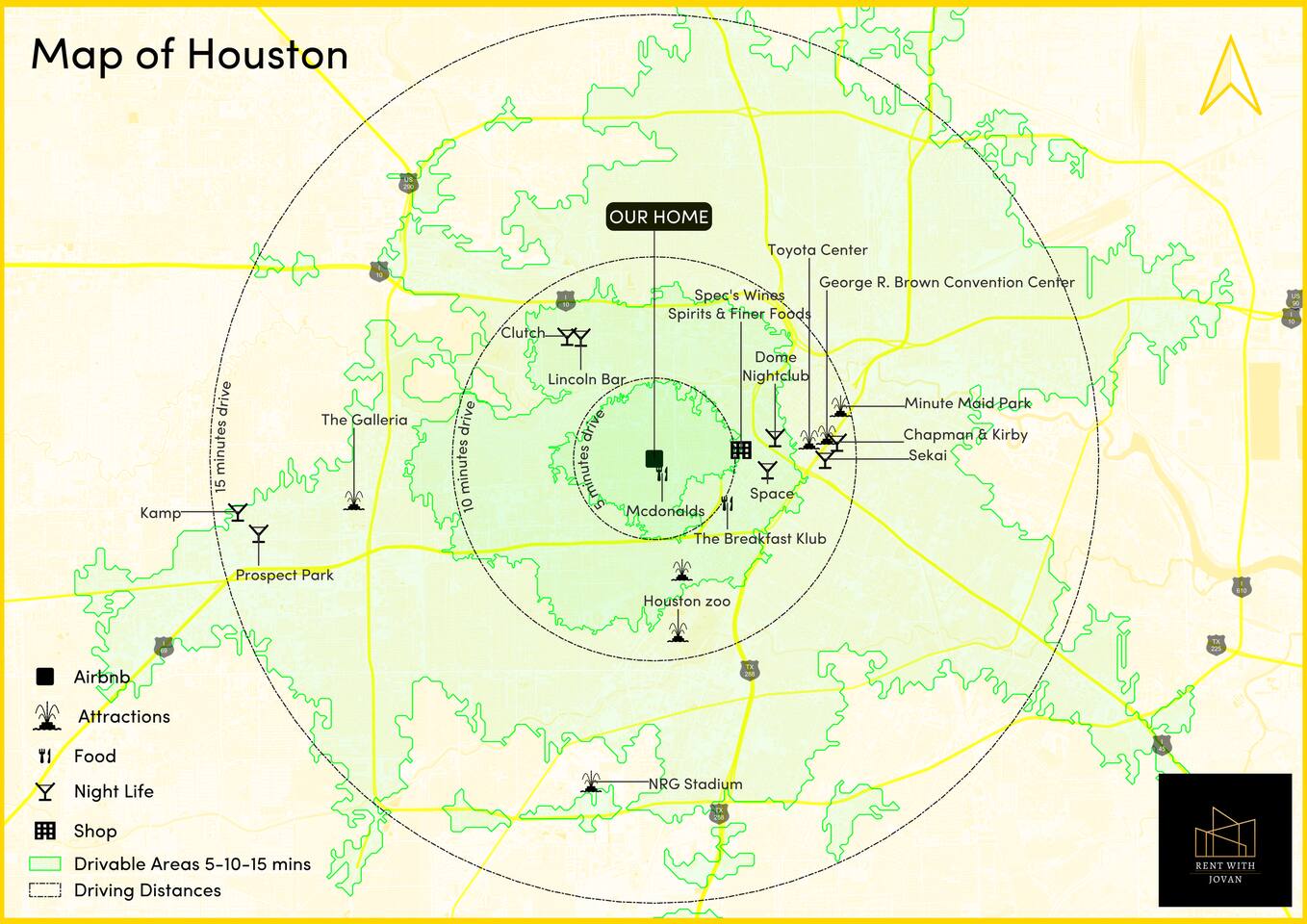 1. Car - Private garage spaces for up to 8 vehicles and an additional 8 outdoor spaces. 2. Lyft/Uber - quick and convenient way to get anywhere in Houston
